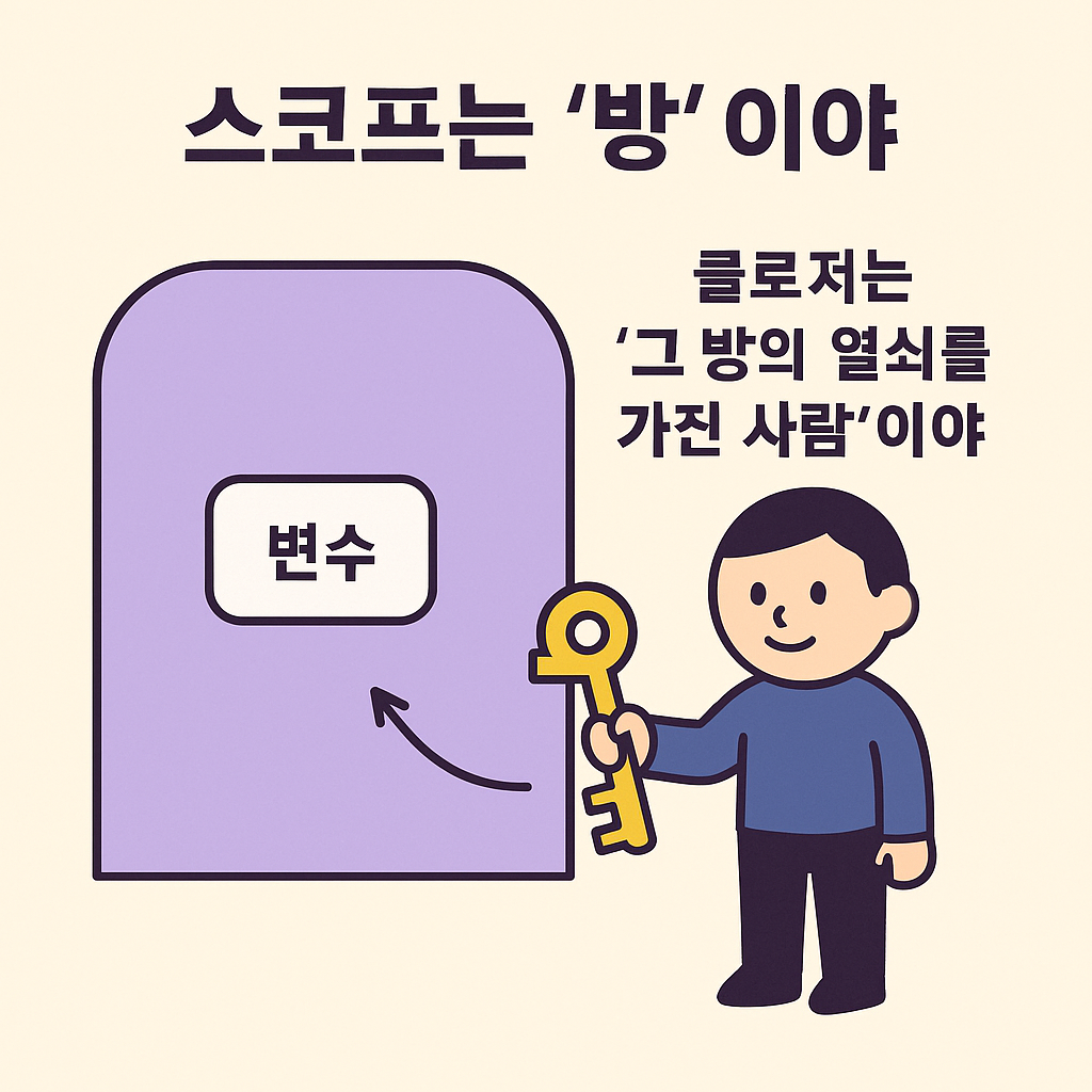 let globalVar = "전역"; function myFunc() { let localVar = "지역"; console.log(globalVar); // 가능 console.log(localVar); // 가능 } console.log(globalVar); // 가능 console.log(localVar); // ❌ 오류! 지역 스코프 밖이니까클로저(Closure): “함수가 기억하는 외부 변수”