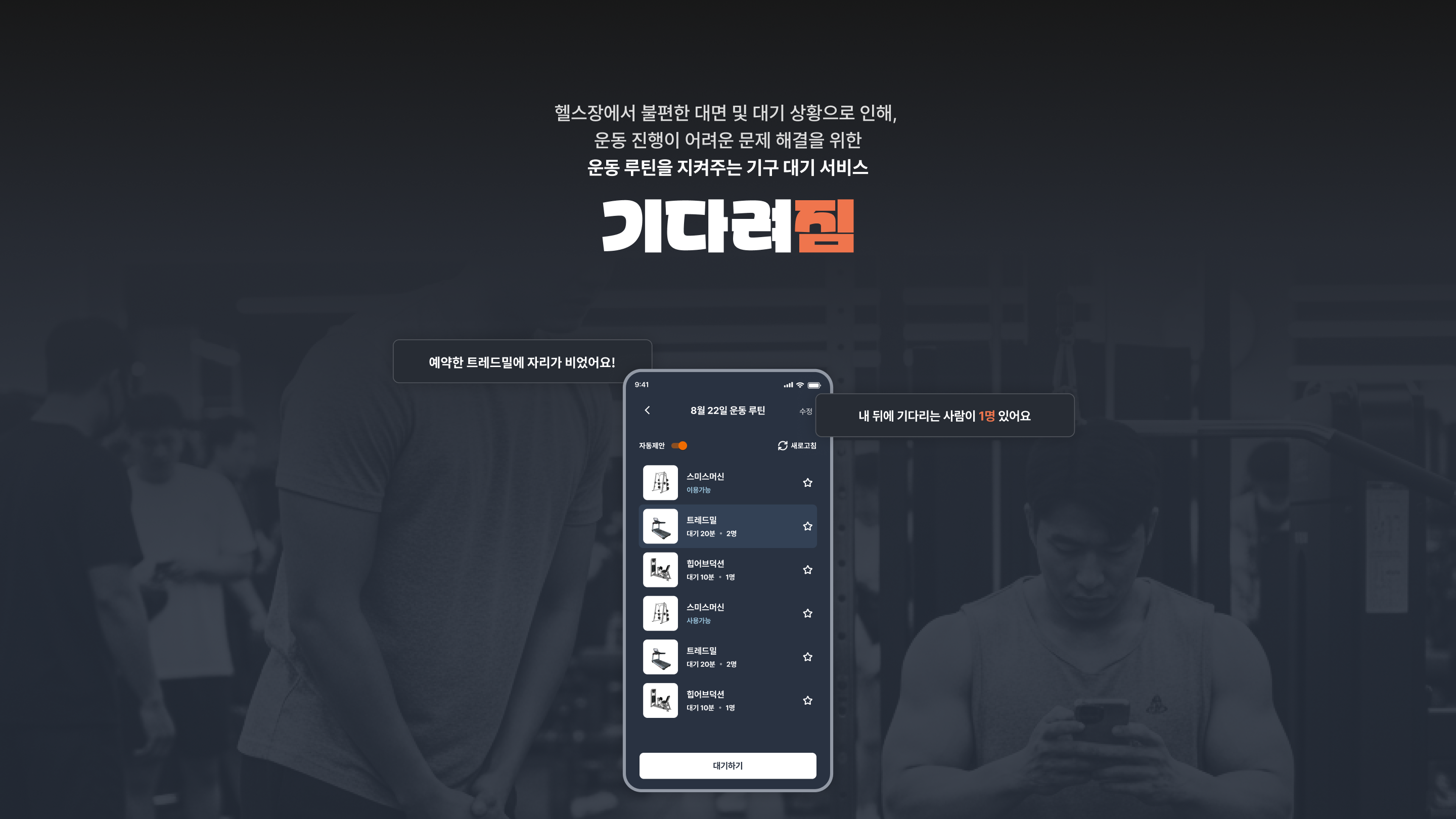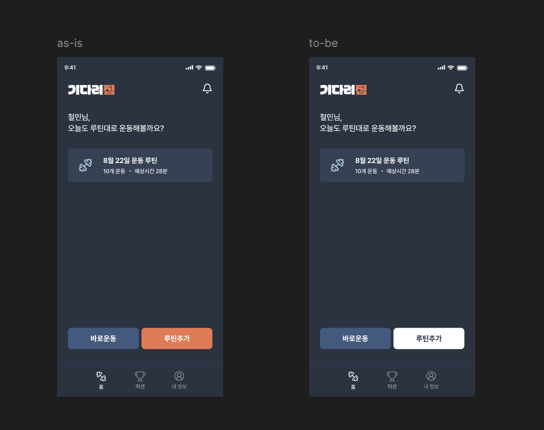 기다려짐의 홈화면 비교 위 화면은 서비스 홈화면인데 하단 오렌지색상 버튼이 WCAG가 정한 4.5:1 명암비에 맞지않아