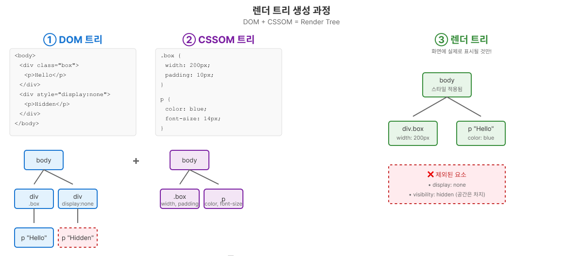 클로드에게 부탁해서 그린 렌더트리 과정- DOM(돔)과 CSSOM(쏨)을 합치면 렌더트리가 된다!